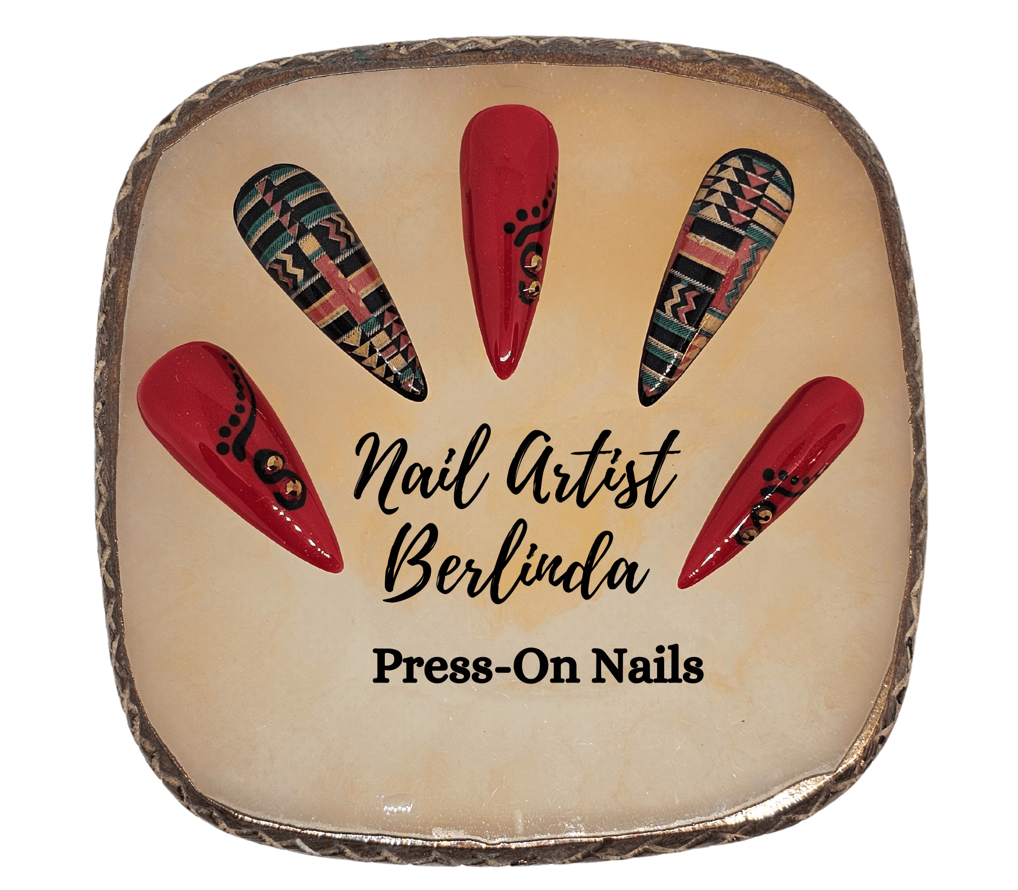 Red with Kente Cloth African Print Stiletto press-on nails: Large 0, 4, 3, 5, 7 Medium