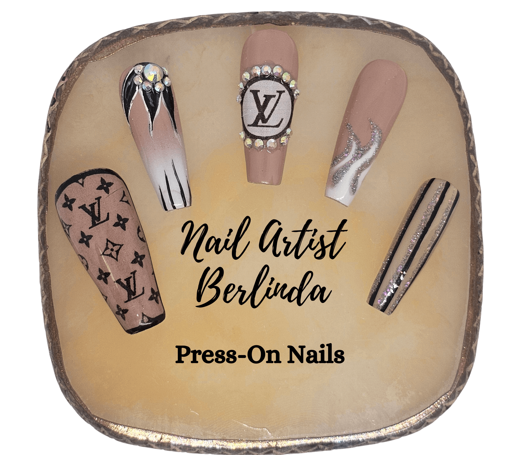Luxury Press-on Coffin Nails in Brown, White and Black adorned with Austrian Crystals: Medium 1, 5, 4, 6, 8 Short