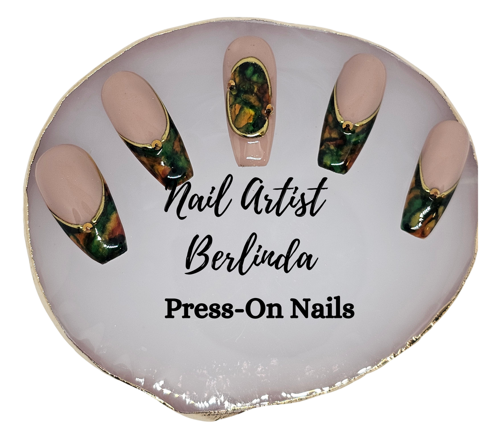 Marbleized Press-on Nails, French Manicure Inspired with Gold Accents: All Sizes (1 - 10) Long