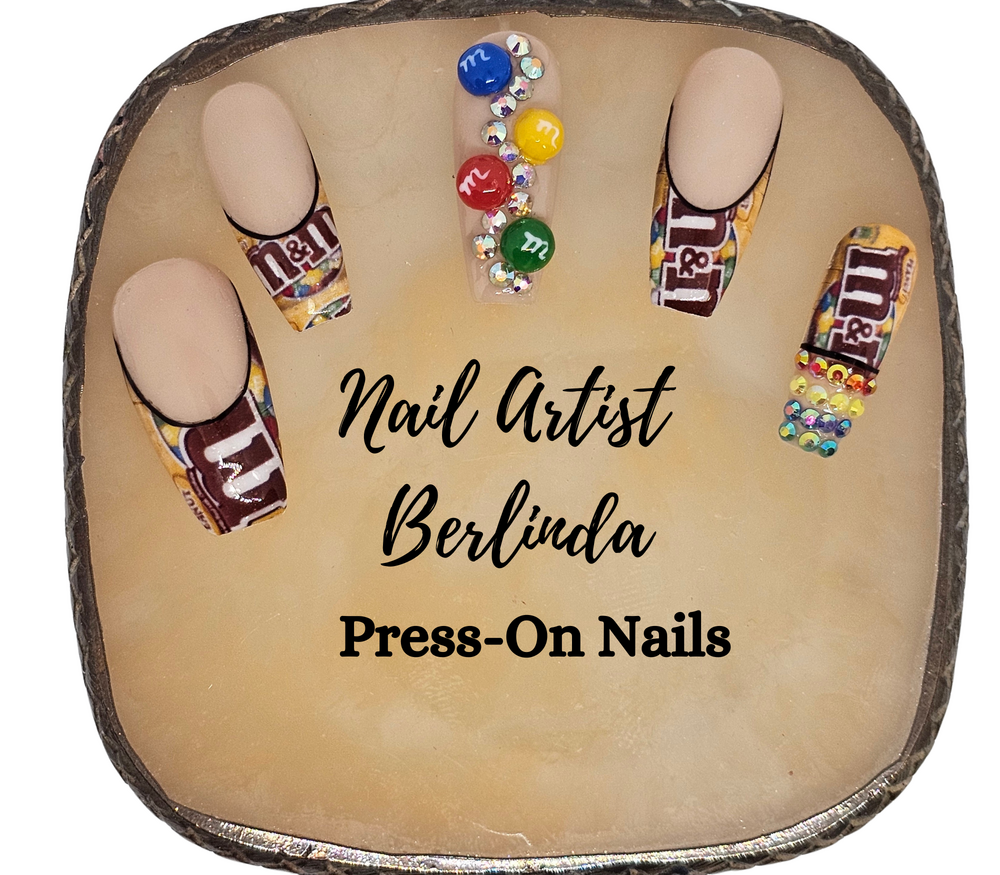 French Manicure Inspired, Candy Press-On Nails with 3D Candy, and Jelly Rhinestones: Small 2, 5, 4, 6, 9 Medium