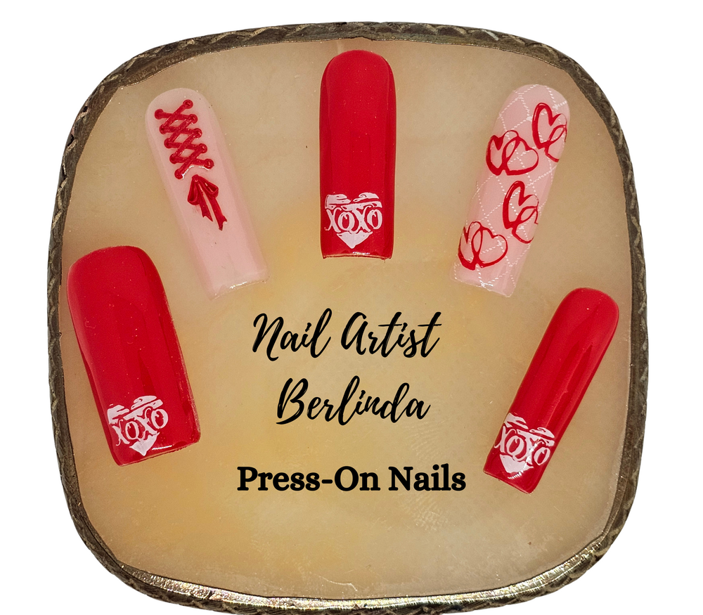 Valentine's Day Press-on Nails with 3D Corsets and Hearts: All Sizes (1 - 10) Long