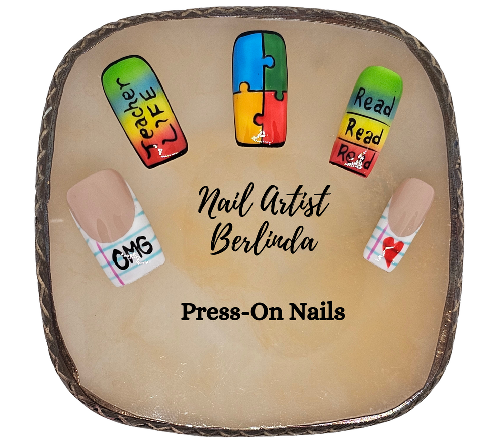 Back to School Inspired Press-on Nails with a Puzzle Nail, Paper, a Heart, Teacher Life, and Read, Read, Read Signatures: Long All Sizes (1 - 10)
