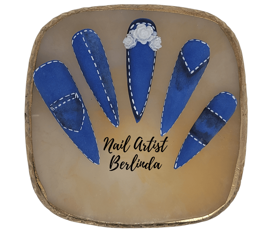 Blue Denim-style Press-on Stiletto Nails paired with Stunning 3D Flowers: Medium 1, 5, 4, 6, 8 Medium